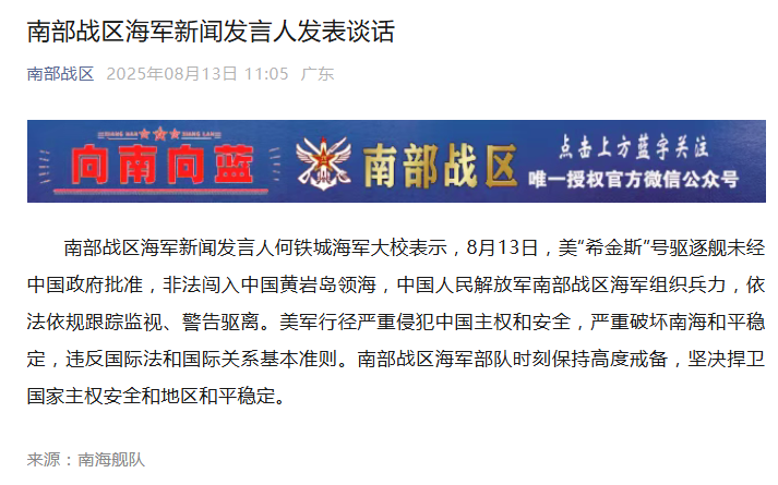 “南部戰區”公眾號截圖 中國人民解放軍南部戰區海軍新聞發言人何鐵城海軍大校表示,8月13日,美“希金斯”號驅逐艦未經中國政府批准,非法闖入中國黃岩島領海,中國人民解放軍南部戰區海軍組織兵力,依法依規跟蹤監視、警告驅離。 何鐵城指出,美軍行徑嚴重侵犯中國主權和安全,嚴重破壞南海和平穩定,違反國際法和國際關係基本準則。南部戰區海軍部隊時刻保持高度戒備,堅決捍衛國家主權安全和地區和平穩定。 對於“希金斯”號非法闖島的意圖,南京大學中國南海研究協同創新中心高級研究員、浙江工業大學區域國別研究院執行院長成漢平13日對香港中通社表示,“希金斯”號驅逐艦隸屬美軍現役主力的伯克級驅逐艦,排水量達9000多噸,裝備先進的宙斯盾系統和96單元的MK 41垂直發射系統,整體作戰實力在美軍名列前茅。“希金斯”號非法闖入黃岩島,是對中國赤裸裸的軍事挑釁,已形成海上挑戰,因此可以看到中方毫不客氣,霸氣出手驅逐。 成漢平分析,中美暫停雙方關稅90天,留出下一步談判空間,此時美方派軍艦強闖黃岩島,是有意識向中方展示美方還有多少牌可以打出,試圖逼中方在關稅方面做出一定讓步。“美國潛台詞很清楚,今日打‘南海牌’,明日就可能打‘台灣牌’。特朗普團隊一定在認真思考,怎樣才能讓中方讓步。但美方手中其實沒有太多牌,千方百計找補,台灣牌將是其最關鍵、也是最後一張牌。” 美“希金斯”號非法闖島之前,菲律賓方面挑釁動作不斷。8月11日,菲方組織多艘海警船、公務船侵闖,以給漁船運補為幌子,不顧勸告執意侵闖黃岩島。8月6日,菲總統馬科斯涉台言論玩火,稱若台海爆發衝突,菲律賓無法置身事外。8月4日,菲律賓與印度在南海展開聯合軍演。 成漢平指出,菲中期選舉已證明,馬科斯外交政策不受歡迎,但其仍一意孤行,是想藉在南海的所謂強悍行動,賣力表現,尋求美國對菲關稅下調,并獲取美、日、澳等盟友的軍援裝備和情報支持,提升自身實力。 成漢平續指,美方派“希金斯”號強闖黃岩島的另一目的,是為菲律賓站台撐腰,向菲律賓發出信號,令其繼續對中國進行各種挑釁。特朗普政府并非在配合馬科斯,而是圍繞美國利益拿捏,按自身步驟推進,要求菲方配合。此舉不僅會造成菲方誤判,為未來南海局勢帶來更多不確定性,也會令中美關稅談判面臨新的困境,不利中美關係改善。(完) 【編輯:淩玉輝】