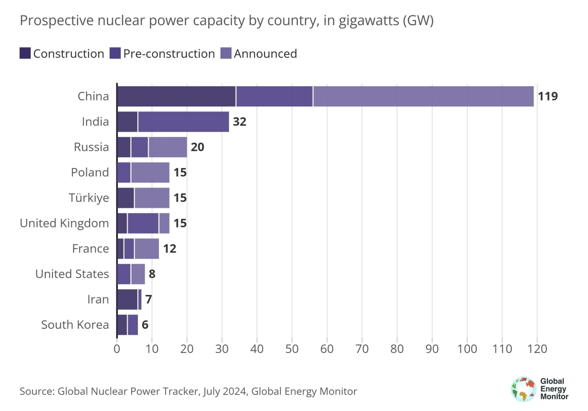 不同國家的核電未來裝機容量(圖源:美國智庫GEM) 中國核建設顯示出向新技術的轉變 GEM研究認為,除了發展速度快,中國在核電新技術的開發和部署方面也發揮著重要作用,特別是第三代和第四代反應堆。“根據發展時間和技術設計的不同,核電技術有四代,目前,第二代核電技術占全球運營能力的大部分。大多數美國和法國的核電站反應堆都屬於第二代。與美國和法國一樣,就總容量而言,中國運營的核電站也以第二代核電站為主,但隨著越來越多的第三代反應堆上線,這種平衡正在發生變化。” 研究人員分析認為,相對比第二代技術來說,第三代反應堆包括額外的安全設計元素,可以減少主動控制或干預,以防止干預發生的故障時產生事故。“中國設計并實施了自己的第三代反應堆,比如具有完整自主知識產權的第三代核電‘華龍一號’機型,已在中國的4座核電站投入使用,另外13座核電站正在建設中。此外,中國還在巴基斯坦和阿根廷部署了‘華龍一號’,并把這項技術稱為‘中國核能走向世界的國家名片’,說明中國不僅希望通過自己的技術滿足更多的國內核能需求,還尋求將自己打造成國際核電市場的技術領導者和供應商。” GEM總結道:“中國還參與了第四代設計的核技術進步,這是反應堆設計的下一個演進階段。2023年12月,全球首台四代核機組在山東華能石島灣核電站正式投入商業運行,作為小型模塊化反應堆,它具有更靈活和快速建設的特點。” 有望在未來十年內縮小中美差距 “近幾十年來,中國并不是唯一一個擴大產能的國家。在過去十到十五年里,其他十大核電運營國家中的幾個國家都增加了裝機容量,包括俄羅斯、韓國和印度。就總運營核能力而言,美國仍然以相當大的優勢領先世界。” GEM認為,儘管美國目前以 94 台核電機組在運行中處於領先地位,但中國正在進行的建設進展使其有望在未來十年內縮小中美差距。 “中國需要超過 100 吉瓦的運營能力才能超越美國,成為擁有最大核電設備的國家。一些預測認為這種情況早在本世紀末就會發生,從目前的數據來看,中國的預期裝機容量118吉瓦,僅統計其中約25%的有目標開工年的數據,將使該國的運營裝機容量達到88吉瓦。在所有潛在產能投入運營的情況下,不考慮退役的情況,中國將輕鬆超越美國,擁有世界上最大的運營核電量。”(完) 【編輯:馮赫棠】