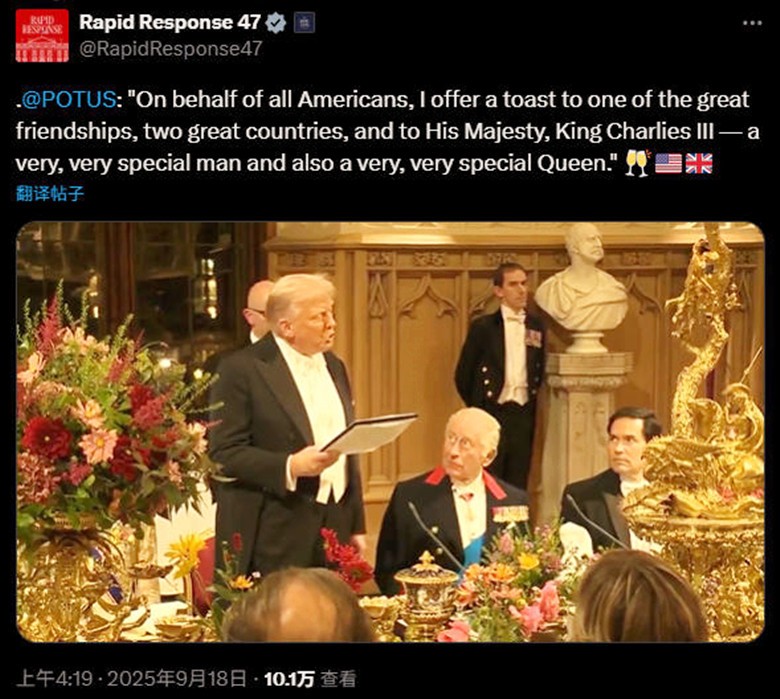 特朗普在歡迎宴會上致辭,稱讚查爾斯三世為“一位非常、非常特別的男人”。社媒X視頻截圖 當地時間16日晚,特朗普攜夫人梅拉尼婭抵達英國,開始他對英國的第二次國事訪問。特朗普稱,此次訪問的主要目的是會見英國國王查爾斯三世,“他完美地代表了這個國家,是一位極具風度的紳士”。 與此同時,為鞏固英美兩國的關係,英國政府為這次訪問做足了準備。英國國王查爾斯三世、王子威廉和1500多名士兵將於17日在溫莎城堡舉行歡迎儀式,以隆重的禮節迎接特朗普。 “查爾斯國王鋪開紅地毯,向特朗普示好。”美國《華爾街日報》9月15日發文稱,隨著英國的經濟和軍事實力持續下滑,王室的軟實力已成為英國政府依賴的“王牌”。在英美“特殊關係”變得越來越不平衡的當下,英國迫切需要利用王室的禮遇來維繫美國領導人的好感。 但民調機構益普索近期的民意調查顯示,越來越多的英國民眾對英美在二戰後確立的“特殊關係”提出質疑,只有約36%的受訪者認為兩國存在“特殊關係”。一名前英國外交官坦言,英美已在價值觀和政策方面出現根本分歧,“差異比二戰以來的任何時候都要深刻”。(完) 【編輯:豐悅】