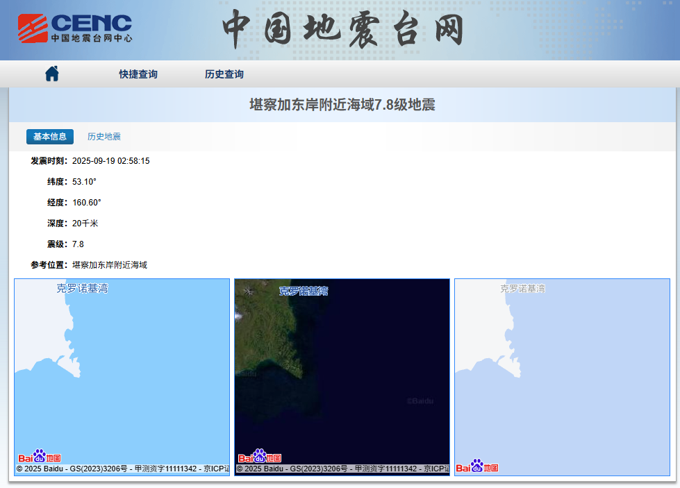香港中通社9月19日電 北京時間19日凌晨2時58分,在俄羅斯堪察加東岸附近海域發生7.8級地震,震源深度約20公里,震中位於北緯53.10度、東經160.60度。該區域海拔較低,震中5公里範圍內平均海拔約-3878米,位於深海域。