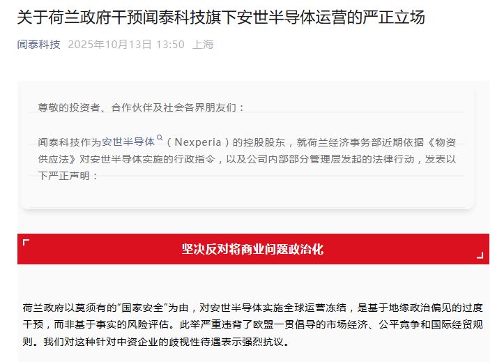 (聞泰科技公眾號截圖) 據報道,荷蘭政府引用的是70多年前冷戰時期通過的《貨物可用性法案》,目的是“確保歐洲能夠不受限製地獲取安世半導體生產的芯片”。而就在荷蘭政府下達命令的前一天,特朗普政府擴大美國對華出口管制“實體清單”,將被列入美國黑名單的中企的子公司也納入其中,安世科技正落入管制之列。聞泰科技方面指出,荷蘭是以美國新規為藉口接管安世的。 “中方一贯反对泛化国家安全概念、针对特定国家企业采取歧视性做法,”中国外交部发言人林剑周一在例行记者会上表示。“中方维护自身正当合法权益的决心坚定不移。” 處在風暴中心的聞泰科技是一家成立於1993年的企業,總部位於浙江嘉興,原本是一家以消費電子業務為主的企業,深耕智能手機領域。2019年,聞泰科技為了解決核心元器件依賴進口的問題,同時看準了汽車電子化浪潮中的巨大需求,決定在2019年花巨資收購安世半導體。 而安世半導體前身為飛利浦公司的半導體部門,是擁有百年歷史的行業巨頭,客戶包括博世、華為等知名企業。自聞泰科技收購安世後,後者在全球功率分立器件公司中的排名從2019年的第11名穩步上升到第3名。2022年,安世半導體營收達到23.6億歐元的峰值,近五年為荷蘭貢獻了1.3億歐元的企業所得稅,而且,安世還在2024年11月還清了所有前期債務。顯然,這一收購案是對各方都有利的多贏局面。 那麼,荷蘭政府為何會突然翻臉,對當初開門迎來的中企下手? 財經、國際評論員魯寧在接受香港中通社採訪時表示,對於聞泰科技當年投資安世,歐洲是歡迎的,被認為能為歐洲帶來稅收和就業的益處。但安世半導體得到中企的資源注入後,迅速成長為行業內前列的公司,這就觸犯到了美國的利益,違反了美國“限制中國獲得半導體領域的先進能力”的大戰略,從而被美方盯上。 在這個時候,安世半導體高層發生了內亂。2025年10月1日,安世半導體的三名外籍高管向荷蘭企業法庭提交了對公司調查和採取臨時措施的緊急請求。7日,法庭做出裁決,停止了聞泰科技創辦人張學政在安世半導體的職務,指派一位外籍人士擔任安世半導體的代表,並將聞泰科技擁有的安世股份的絕大部分託管給法庭指定的人員,從而實際上奪取了聞泰科技對安世半導體的控制權。 魯寧表示,中企在國外運營子公司時,多數存在與外方的磨合問題,中企的一些習慣性做法,也可能和當地的規範不完全一致,引發摩擦,這就給了一直“虎視眈眈”的美國有關機構以口實,施壓荷蘭政府對中企採取措施。目前,荷蘭執政的是看守政府,其領導人面臨極右翼政黨的威脅,地位脆弱,需要得到美國的支持繼續執政,因此對美國的要求採取了配合的態度。 今年6月,荷蘭執政聯盟中佔主導的極右翼自由黨因難民庇護問題退出,前情報領導人、執政聯盟推舉的首相斯霍夫所領導的聯合政府被迫辭職,執政不足一年。斯霍夫繼續擔任看守政府首相。 魯寧認為,荷蘭政府此次的做法,是要給美國一個交代,目的是拖慢中企控制的半導體公司的發展步伐。事實上,安世半導體所研發的產品,中國很多企業也在做,只不過安世的技術更先進一些。美國和荷蘭政府的做法,短期內確實會對中企的技術提升帶來影響,但只是拉長了這一時間,不能改變大的方向。 他也表示,中企“走出去”,未來類似的收購也可能會遭到美國及其盟友的阻擊,需要盡可能在所在國以更高的標準規範運營,避免給對方創造介入和干預的口實。(完) 【編輯:淩玉輝】