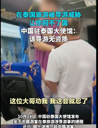 (視頻截圖) 據泰方核實,該導游持中國護照,在泰無導游資質。其企圖逼迫遊客購物並通過遊客消費獲取提成,泰方已對涉事旅行社進行調查追責。 在泰國威脅中國遊客的黑導游已被逮捕,系中國籍公民,長期在泰國非法執業,7年前曾因強迫購物在泰國被捕。 據三湘都市報報道,10月13日,有網友發布視頻稱在泰國旅遊時,遭遇強制消費,導游態度囂張,用中文威脅遊客“不消費就讓你回不了中國”“到了免稅店讓你上不了車”等,還手指拍攝者要求“把視頻給我删了”。 事件曝光後,泰國國家旅遊局表示將嚴肅處理涉事導游和旅行社。泰國旅遊警察第一局代理局長頌差親自帶隊調查。 目前,涉事導游已被泰國警方逮捕,他承認因遊客購物太少無法獲得回扣而恐嚇遊客。此外,涉事旅行社的兩名負責人也因非法從事導游行業工作被捕,面臨最高2年監禁和50萬泰銖(約1.53萬美元)的罰款。(完) 【編輯:李彥洲】