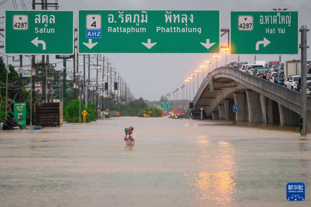 11月25日,一名男子在泰國宋卡府合艾市郊涉水前行。新華社圖片 泰國防災減災廳25日發布通報稱,連日洪災使超過268萬人受到影響。泰國地理信息與空間技術發展局發布的衛星監測數據顯示,泰國南部宋卡、北大年、博他侖等7個府受洪災影響較大。 自11月21日起,泰國南部宋卡、北大年、博他侖等7個府因強暴雨引發洪水侵襲,包括醫院在內的諸多建築均浸泡在水中,災情慘重。(完) 【編輯:馬華】