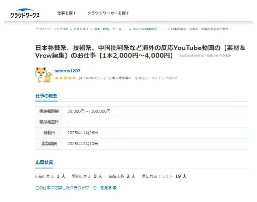 涉事招聘信息相關截圖 據日本“J-CAST”新聞網3日報道,有網民發現該網站上曾發布一則招聘廣告,內容為“撰寫抹黑中國人形象的虛構YouTube視頻劇本”,並明確要求視頻需“稱讚日本人、貶低中國人”。每段劇本報酬為2000至4000日元(折合約13至26美元),且註明“內容可完全虛構”,甚至鼓勵抄襲修改現有視頻以偽裝成原創作品。 報道指出,該招聘信息由同一用戶分別於今年5月28日及11月26日兩次發布,目前已從網站下架,但相關截圖已在社交媒體廣泛流傳。截圖顯示,已有人應聘該崗位。此外,該用戶過往還多次發布類似內容,包括製作“抨擊中國、韓國”的視頻劇本,顯示出系統性操作傾向。 事件曝光後,日本社會反應不一。部分網民表示並不意外,指出當前日本YouTube平台上充斥大量粗製濫造、模板化的反華視頻,明顯出自“流水線式生產”;也有網民表達羞恥之情,稱“作為日本人對此感到難堪”。輿論普遍質疑此類內容助長網絡仇恨,損害國際形象。 面對媒體質詢,“雲工作”網站承認該招聘信息違反其平台規定,現已刪除,並解釋其審核機制採用“AI初篩+人工複核”模式。然而此次AI未能識別相關內容的違規性質,導致信息上線。平台表示已緊急更新AI數據庫,強化對歧視性、煽動性內容的識別能力,防止類似事件重演。(完) 【編輯:葉永成】