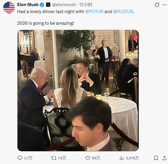 馬斯克X截圖 美媒稱,這張照片拍攝於海湖莊園舉行的一場活動中,特朗普和馬斯克似乎已修復他們此前一度緊張的關係。馬斯克曾擔任美國政府效率部負責人,而後與特朗普圍繞“大而美”稅收和支出法案等問題產生嚴重分歧,大打“口水仗”,一度成為美國輿論焦點。 值得一提的是,美國《新聞周刊》4日稱其還獲得特朗普在海湖莊園宴請馬斯克的另一張照片。報道稱,照片拍攝時間似乎與“星鏈”稱要為委內瑞拉提供一個月免費寬帶服務的時間一致。 當地時間3日凌晨,美國對委內瑞拉發起大規模軍事行動,突襲委首都加拉加斯並擄走委總統馬杜羅及其夫人。美國太空探索技術公司旗下衛星互聯網項目“星鏈”3日表示,將為委提供一個月免費寬帶服務至2月3日。“星鏈”沒有作進一步解釋。目前委網絡連接基本正常。 “星鏈”3日通過社媒發布消息稱:“將為委內瑞拉民眾提供免費寬帶服務至2月3日,確保網絡連接不中斷。”馬斯克4日在X上發帖稱,此舉是為了支持委內瑞拉的人民。(完) 【編輯:淩玉輝】