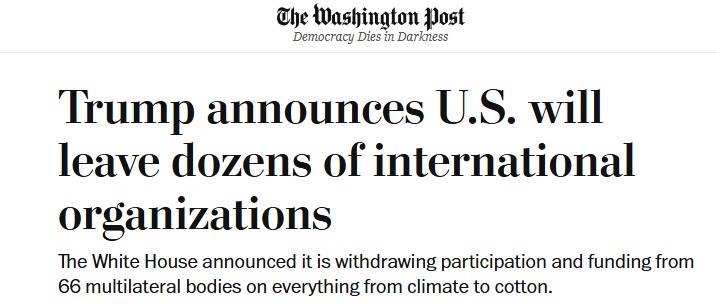 《華盛頓郵報》網站報道截圖 外媒評論認為,此舉不僅引發國際範圍的軒然大波,也徹底切斷了美國與主導國際氣候合作的法律框架之間的關聯。美國前白宮國家氣候顧問吉娜·麥卡錫直言,這一決定“目光短淺、令人蒙羞且極其愚蠢”。 《華盛頓郵報》的報道指出,美國將退出數十個與聯合國相關的國際組織,標誌著華盛頓從氣候變化到棉花貿易等全球合作領域的全面收縮。 《洛杉磯時報》的報道稱,這一最新舉措將在關鍵時刻進一步讓美國孤立。報道舉例說,《聯合國氣候變化框架公約》是一項於1992年制定、近200個國家簽署的全球條約,旨在通過協調的國際行動應對氣候變化,包括限制導致地球變暖的溫室氣體排放。然而去年,美國拒絕派遣高級官員參加在巴西舉行的聯合國締約方大會,這一舉措已引發關注。 世界資源研究所所長大衛·維達斯基則指出,這項已有30年曆史的協議是國際氣候合作的基礎。離開不僅會讓美國處於邊緣,還會讓美國完全退出競技場。 英國《衛報》的報道也聚焦了美國退出《聯合國氣候變化框架公約》。報道援引聯合國氣候事務負責人兼《聯合國氣候變化框架公約》執行秘書西蒙·斯蒂爾的觀點稱,此舉是“巨大的自殺”。(完) 【編輯:李彥洲】