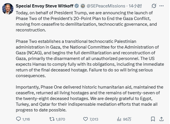 美國特使威特科夫X截圖 他又表示,美國希望哈馬斯全面履行停火協議義務,包括立即歸還最後一名以色列人質遺體,否則將面臨嚴重後果。 以色列則一直反對啟動該計劃第二階段,指哈馬斯在解除武裝及歸還最後一名人質遺體方面毫無進展。 同日,加沙地帶停火斡旋方埃及、卡塔爾和土耳其發表聯合聲明,宣布巴勒斯坦技術官僚委員會已完成組建,將負責管理加沙地帶。該委員會將由原巴勒斯坦高級官員阿里·阿卜杜勒哈米德·沙阿斯領導。 據沙特阿拉伯阿拉比亞電視台報道,阿里·阿卜杜勒哈米德·沙阿斯出生於加沙地帶南部城市汗尤尼斯,先後在埃及、英國獲得土木工程學士、碩士和博士學位,曾在巴勒斯坦民族權力機構擔任計劃部副部長、交通通信部副部長等多個高級職務,退休後出任住房與公共工程部顧問。(完) 【編輯:淩玉輝】