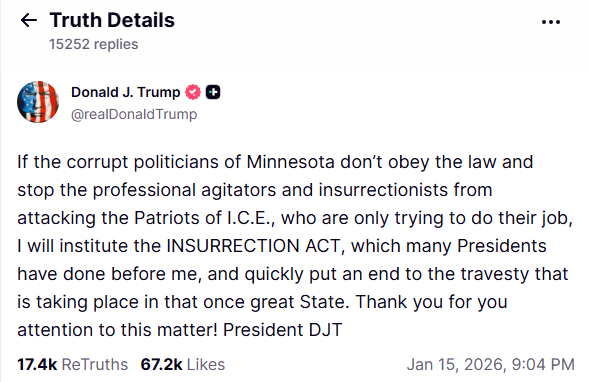 特朗普社媒截圖 特朗普當天在社交媒體發文稱:“若明尼蘇達州腐敗政客不遵守法律、不制止那些攻擊僅履行職務的移民與海關執法局‘愛國者’的職業煽動者與叛亂分子,我將啟動《叛亂法》。” 《叛亂法》是一部頒布於1807年的法律,授權總統在美國本土動用正規軍隊執行國內執法任務。該法案上次啟用是在1992年洛杉磯騷亂期間。 此次明尼蘇達州示威的導火索,源於上周移民部門人員在明尼阿波利斯市執法期間開槍擊斃一名美國女性公民,此舉激起民眾不滿。當局事後更增派執法人員進駐,多次與示威者發生衝突。14日,聯邦執法人員又在當地開槍擊中一名男子腿部,進一步加劇了緊張局勢。 過去幾天,抗議示威持續升級:執法人員動用催淚瓦斯與震爆彈驅散人群,部分示威者則以燃放煙花回應。 明尼蘇達州民主黨籍州及地方官員譴責聯邦執法力量的介入,稱其已對社區造成嚴重破壞;特朗普政府則為行動辯護,強調這是清除非法居留移民的必要舉措。 特朗普此前曾多次威脅動用《叛亂法》,並稱其為“總統擁有的最強大權力”。分析指出,特朗普的最新表態表明,《叛亂法》已成為他推進數月來加強聯邦政府對民主黨執政城市及州控制力計劃的選項之一。 若正式啟動《叛亂法》,特朗普將可繞過1878年《地方治安法》——該法明確禁止美軍執行國內執法任務。(完) 【編輯:淩玉輝】