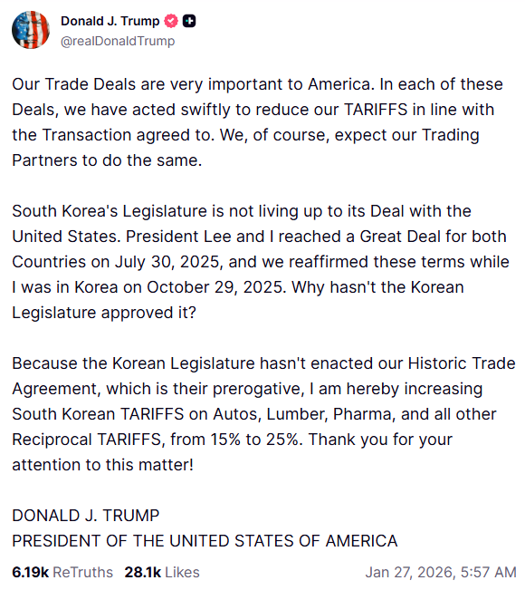 特朗普社媒截圖 特朗普稱,韓國立法機構“未能履行與美國達成的協議”,稱該協議是其與韓國總統李在明於2025年7月30日達成,並在其2025年10月29日訪韓時再次確認。 韓國總統府本月27日表示,將針對特朗普宣布提高關稅一事召開會議,研究對策。韓國總統府還表示,美國政府並未正式通知韓方相關內容或說明具體情況。 韓聯社27日報道,正在加拿大訪問的韓國產業通商部長官金正官將儘快轉赴美國,計劃會晤美國商務部長盧特尼克,就相關事宜交換意見。 韓美領導人2025年10月29日在韓國慶州舉行會談,兩國2025年11月13日共同發表聯合情況說明書指,韓方將對美方進行3500億美元投資,美方則下調針對韓國產汽車等商品的關稅,並同意韓方引進核動力潛艇,擴大韓方鈾濃縮及乏燃料後處理許可權。 此後,韓國執政黨共同民主黨於2025年11月26日發起《對美投資特別法案》,美方2025年12月4日發布公告,官宣對韓國輸美汽車的關稅稅率下調至15%,追溯自11月1日0時1分(美國東部時間)起生效。(完) 【編輯:淩玉輝】