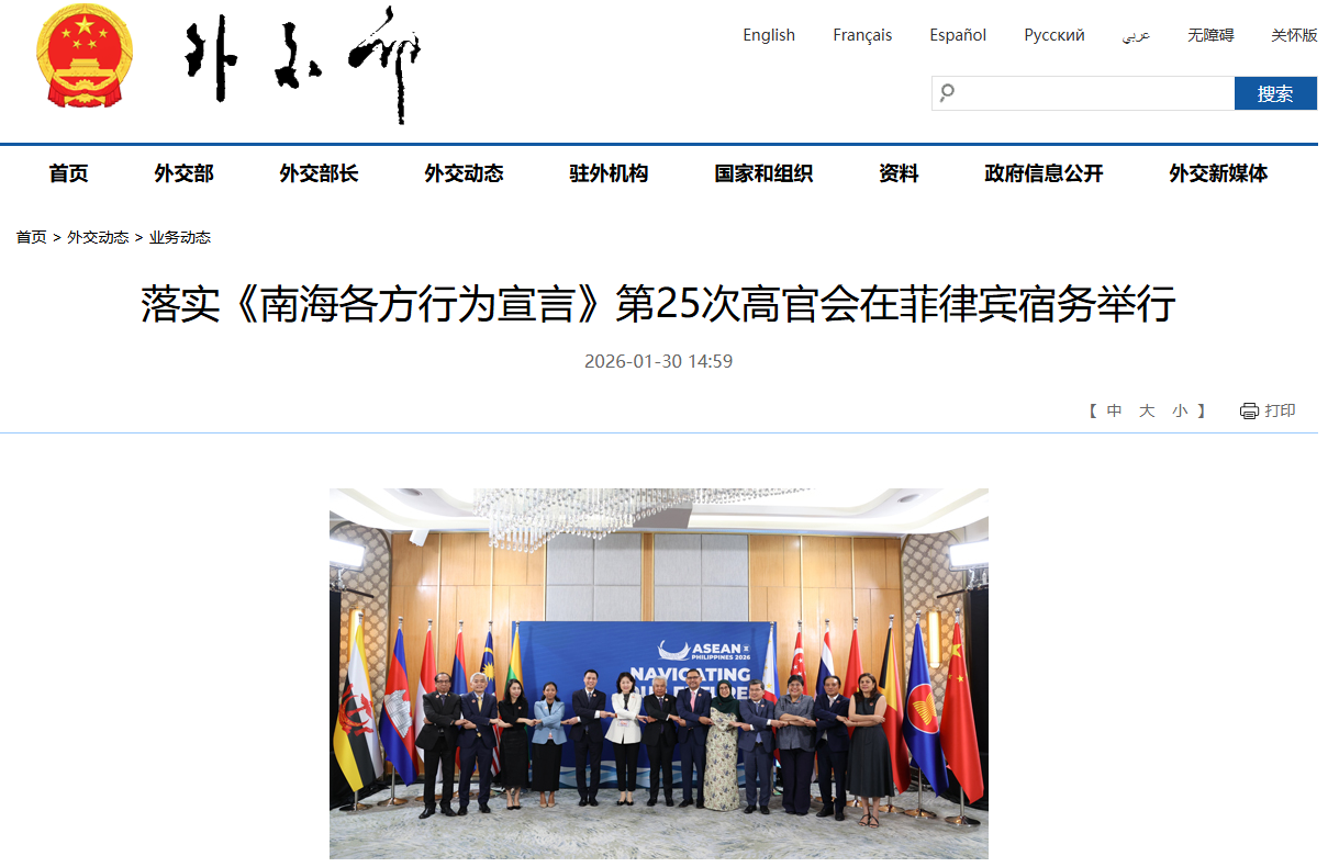 圖片來源:中國外交部網站截圖 據中國外交部當天消息,中國外交部邊海司司長侯艶琪與馬來西亞外交部秘書長阿姆蘭共同主持會議,東盟各國高官及代表出席。 與會各方一致認為維護南海和平穩定具有重要意義,支持加強對話,保持克制,妥處分歧,增進互信,維護海上局勢穩定。各方同意繼續全面有效落實《宣言》,深化海洋環保、科研、搜救、執法等領域合作。 據介紹,1月30日至2月1日,中國和東盟國家還將舉行落實《宣言》第51次聯合工作組會。 中國與東盟各國外長及代表於2002年11月在柬埔寨金邊簽署《宣言》,確認各方共同維護南海和平穩定、通過友好協商解決爭議的共識。 2025年3月7日,中共中央政治局委員、外交部長王毅在兩會記者會上表示,實現南海的睦鄰友好、長治久安,靠信任,也要有規矩,關鍵是要落實好《南海各方行為宣言》、制定好“南海行為準則”。在中方推動下,“準則”的磋商進程正在加快,已經完成了案文三讀,中方對達成“準則”充滿信心。(完) 【編輯:林曉惠】