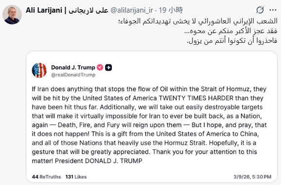 圖片來源:伊朗最高國家安全委員會秘書拉里賈尼社交平台截圖 拉里賈尼在X平台上表示:“伊朗不害怕你 (特朗普) 的空洞威脅。比你更強大的勢力都未能消滅伊朗,小心別讓你自己被殲滅!” 這番言論是回應特朗普9日在社媒上的發文。特朗普當時宣稱,如果伊朗阻止石油通過霍爾木茲海峽,美國將對伊朗發動“比目前為止強二十倍”的軍事打擊。 同一天,伊朗總統佩澤希齊揚表示,任何妄圖摧毀伊朗的人都對歷史一無所知,侵略者來了又走,伊朗始終屹立。