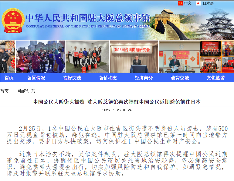圖片來源:中國駐大阪總領館網站截圖 中國駐大阪總領館2月26日發布通告稱,領事館已第一時間向當地警方提出交涉,要求日方盡快破案,切實保護在日中國公民生命財產安全。 總領館稱,近期日本治安不靖,類似案件頻發。駐大阪總領館再次提醒中國公民近期避免前往日本,提醒領區中國公民密切關注當地治安形勢,務必提高安全意識,避免攜帶大量現金出行,切實加強風險防範和自我保護。(完) 【編輯:林曉惠】
