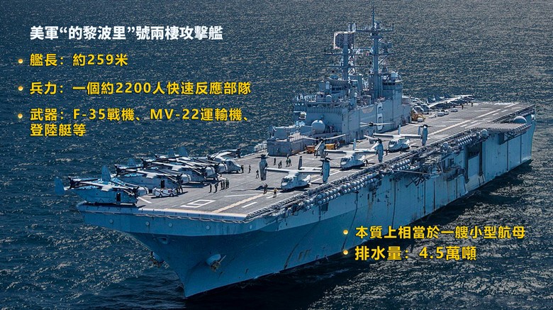 路透社視頻顯示,3月17日“的黎波里”號已行駛至新加坡附近海域。視頻截圖 據介紹,一個美國海軍陸戰隊遠征部隊(MEU)通常包括四個要素:指揮、地面作戰、空中作戰和後勤作戰。MEU通常用於執行撤離、兩棲作戰等需要艦岸轉換的任務,如突襲和攻擊行動。它們還具備地面和航空作戰能力,部分部隊接受過特種作戰訓練。 “的黎波里”號駐扎在日本橫須賀基地,艦長約259米,排水量4.5萬噸,本質上相當於一艘小型航母,可搭載F-35隱形戰鬥機、MV-22魚鷹運輸機以及用於將部隊送上岸的登陸艇。 該軍艦是兩棲戒備群的旗艦艦,通常包括兩棲運輸船塢艦“新奧爾良”號和“聖迭戈”號。CNN無法確認這些較小型艦艇是否與“的黎波里”號同行。