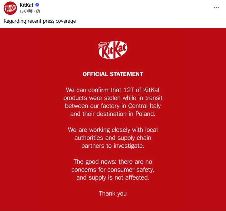 圖片來源:KitKat社交媒體賬號截圖 據環球網援引《紐約時報》稱,這批被盜糖果為奇巧最新推出的世界一級方程式賽車錦標賽(F1)系列特別款,外形被專門設計成了賽車的形狀。2025年,F1成立75周年、奇巧成立90周年之際,雙方正式確立合作夥伴關係。今年1月,正值奇巧作為F1官方巧克力合作夥伴的首個賽季,雀巢為此推出這款F1賽車聯名巧克力,試圖借賽事熱度拓展市場,不料卻遭遇如此荒誕的打擊。 對此,雀巢發言人在發表聲明時,還不忘借用奇巧的品牌廣告語調侃道:“我們一直鼓勵大家‘拿塊奇巧,休息一下’,沒想到這些盜賊真的按照字面意思,把巧克力‘拿’走了。”發言人表示,此次盜竊事件並未造成人員傷亡,然而,大批貨物的失竊可能會導致近期歐洲超市貨架上的奇巧巧克力出現短缺。考慮到西方傳統節日復活節臨近,復活節假期作為巧克力消費的高峰期,許多消費者今年可能因為這起盜竊案難以買到這款聯名產品。(完) 【編輯:林曉惠】