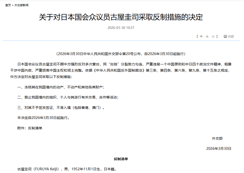 香港新聞網3月31日電 2026年3月30日,中華人民共和國外交部令第20號公布——正式對日本國會眾議員古屋圭司採取反制措施!