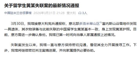 中國駐米蘭總領館微信公眾號截圖 目前,意方需進一步確認身份。中國駐米蘭總領館已第一時間向當事人家屬通報上述情況。 據悉,中國留學生黃某今年1月在相關地區失聯。事件發生以來,中方一直與意大利有關部門保持溝通,推動開展搜尋工作。 中國駐米蘭總領館表示,已將有關情況及時通報當事人家屬。總領館將繼續關注事件進展,並為當事人家屬提供必要協助。 據紅星新聞此前報道,黃某來自貴州興義農村,是四川大學水利水電學院的博士生。2025年8月,他獲得國家留學基金委獎學金,被公派至意大利圖西亞大學進行為期15個月的學術交流,研究方向為“技術促進可持續性和生物技術”。 此前,黃某的姐姐黃女士透露,弟弟前往多洛米蒂似乎是為了採集“論文素材”。黃女士表示,弟弟在大學期間有過戶外徒步經驗,也曾涉足過環境艱苦的地區。(完) 【編輯:林曉惠】
