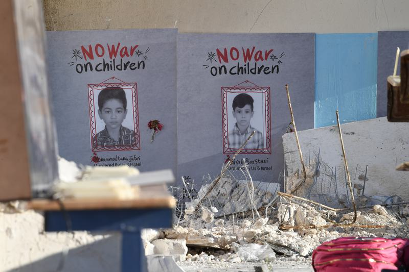 4月6日,在伊朗首都德黑蘭市舉行的悼念活動現場,組織者搭建起小學教室遭襲場景並擺放遇難學生照片,悼念遭美以空襲遇難的米納蔔小學學生。新華社照片