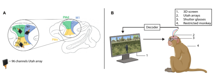 植入部位和實驗裝置。(圖源:《科學進展》網站) 據科技日報報道,研究團隊在3只猴子的初級運動皮層(M1)、背側前運動皮層(PMd)和腹側前運動皮層(PMv)3處運動相關腦區植入電極陣列。電極采集猴子大腦中的神經信號,經由人工智能(AI)模型解碼後,用於控制虛擬現實環境中的“化身”。該VR系統提供立體視覺,并逐步引入更複雜和不可預測的情境。AI解碼模型僅經過一個簡短的被動訓練階段即可投入使用,隨後無需再次訓練。