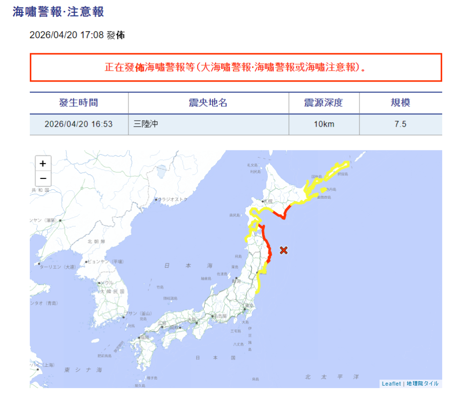 圖源:日本氣象廳官網 稍早前,日本氣象廳發佈消息稱,當地時間4月20日16時53分左右,日本東北部沿海地區發生7.4級地震,最大震感為震度5強,東京有明顯震感。 日本氣象廳隨即對岩手縣及北海道太平洋沿岸中部發布海嘯警報,預計海嘯到達高度為3米;對北海道太平洋沿岸東部與西部、青森縣太平洋沿岸、宮城縣及福島縣則發布海嘯注意報,預計浪高1米。 據央視新聞援引日本氣象廳消息,岩手縣久慈港17時34分觀測到浪高80厘米海嘯,目前潮位仍在上升;岩手縣宮古市17時22分觀測到浪高40厘米海嘯。此外,青森縣八戶港當地時間17時44分觀測到浪高30厘米海嘯;北海道浦河町17時46分觀測到浪高20厘米海嘯;宮城縣石卷市鮎川17時46分觀測到浪高20厘米海嘯。 受地震等災害影響,日本東北新幹線目前已暫停運行。 另據日本廣播協會(NHK)報道,此次地震震中附近有多個核電站及核燃料處理工廠。日本東北電力公司稱,位於宮城縣石卷市和女川町的女川核電站正在確認此次地震是否對其造成異常。女川核電站共有3台機組,其中2號機正在重新運行,1號機已報廢,3號機長期停止運行。據東京電力公司的消息,位於福島縣大熊町和雙葉町的福島第一核電站也正在確認此次地震是否對其造成新的異常影響。位於富岡町和楢葉町的福島第二核電站也在同步確認相關情況。此外,位於青森縣東通村的東通核電站雖然長期停止運行,但目前尚不清楚受影響情況。 除核電站外,青森縣陸奧市和六所村還有兩處核廢料儲存設施,當地也正在確認受影響情況。 在稍後的記者會上,日本氣象廳提醒受地震影響區域民眾在未來一周左右時間內,特別是未來2到3天內,警惕發生同等規模地震的風險,同時呼籲當地民眾繼續採取避難措施,直至海嘯警報和海嘯注意報解除。 截至當天17時30分左右,日本岩手縣、青森縣、北海道三地警方暫未確認到因地震造成損害的信息。 中國駐日本札幌總領館發文提醒領區內中國公民,特別是青森縣、岩手縣、北海道太平洋沿岸地區中國公民,通過官方渠道及時了解地震最新情況,遵循當地政府發佈的避難指令,做好應急避難,遠離海邊,確保人身安全。文章稱,日本氣象廳已針對北海道、青森縣、岩手縣等地沿海地區發佈不同級別的海嘯警報或提醒。注意海嘯可能會反復來襲,不要因為取東西或觀察情況等靠近海岸。如遇緊急情況,請及時報警並與中國駐札幌總領館聯繫尋求協助。 中國駐日本札幌總領館同時提醒,領區中國公民特別是居住在震源地附近中國公民,高度警惕餘震發生及次生災害。出行人員預先了解飛機、鐵路等公共交通工具運行情況,通過總領館微信公眾號及日本媒體等渠道密切關注地震有關信息。 日本緊急求助電話:118(海上事故、海難)、119(消防、急救)、110(警察) 外交部全球領事保護與服務應急呼叫中心熱線:+86-10-12308或+86-10-65612308 駐札幌總領館領事保護與協助電話:+81-11-513-5335 (完) 【編輯:石歡歡】