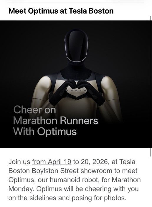 “4月19日至20日,歡迎蒞臨特斯拉波士頓博伊爾斯頓街展廳,與我們的人形機器人Optimus一起迎接‘馬拉松星期一’。Optimus將在場邊與您一同加油助威,並合影留念。”一名美國科技博主在社交平台曬出了特斯拉的邀請函。