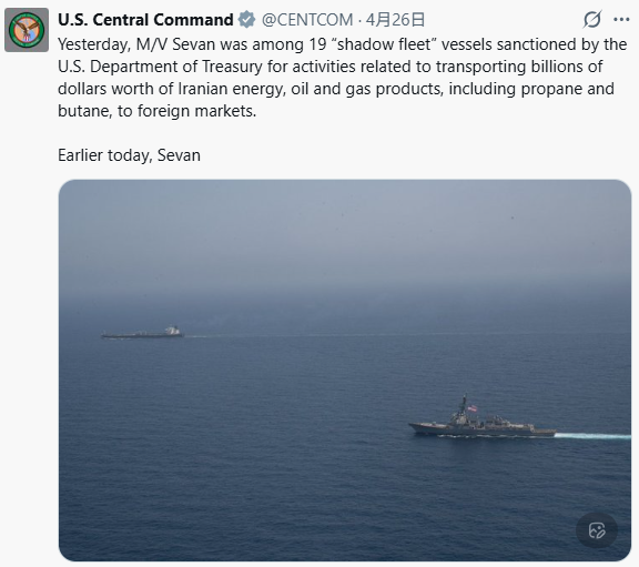 美軍中央司令部社媒截圖 美軍中央司令部25日發聲明說,當天早些時候,美軍平克尼號導彈驅逐艦出動直升機攔截這艘受到美國制裁的商船。目前,這艘商船正按照美軍指令,在押送下返回伊朗。 另據彭博社報道,這艘油輪名為塞凡號(M/V Sevan),是美國財政部24日制裁的19艘與伊朗有關的“影子艦隊”船隻之一,制裁原因是這些船隻涉嫌“向海外市場運輸價值數十億美元的伊朗能源、石油和天然氣產品,包括丙烷和丁烷”。這是美國總統特朗普封鎖伊朗能源出口行動的一部分措施。 中央司令部指出,美軍繼續執行對進出伊朗港口船隻的封鎖。自封鎖措施實施以來,已有37艘船隻被迫改變航道。(完) 【編輯:林曉惠】