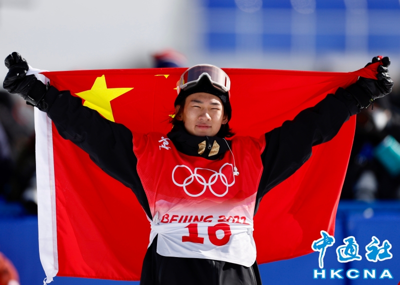 •   2月7日,北京2022年冬奧會單板滑雪項目男子坡面障礙技巧決賽在張家口雲頂滑雪公園舉行。中國選手蘇翊鳴奪得男子坡面障礙技巧銀牌。圖為中國選手蘇翊鳴在比賽後慶祝。 香港中通社圖片