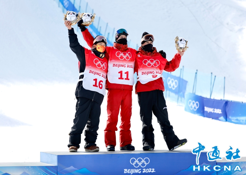 •   2月7日,北京2022年冬奧會單板滑雪項目男子坡面障礙技巧決賽在張家口雲頂滑雪公園舉行。圖為獲得冠軍的加拿大選手馬克斯·帕羅特(中),獲得亞軍的中國選手蘇翊鳴(左)和獲得季軍的加拿大選手馬克·麥克莫里斯在頒發紀念品儀式上。 香港中通社圖片
