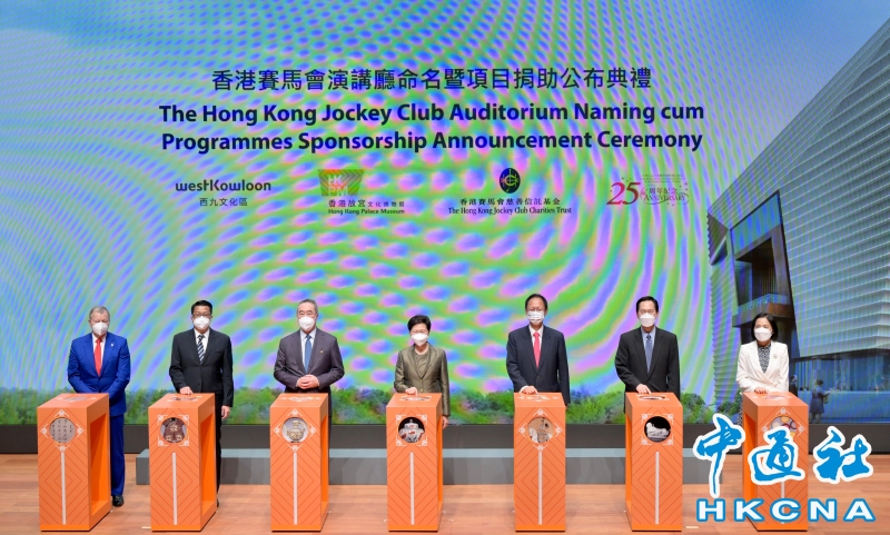 •   6月2日,香港特區行政長官林鄭月娥出席香港故宮文化博物館香港賽馬會演講廳命名暨項目捐助公佈典禮。圖為(左起)香港賽馬會行政總裁應家柏、署理民政事務局局長陳積志、西九文化區管理局(西九管理局)董事局主席唐英年、特首林鄭月娥、香港賽馬會主席陳南祿、香港故宮文化博物館董事局主席陳智思和西九管理局行政總裁馮程淑儀在典禮合照。 香港中通社圖片
