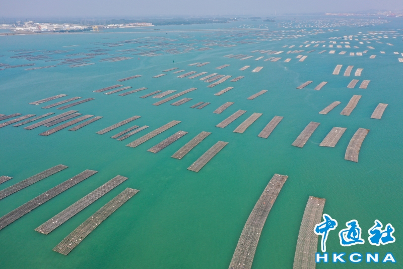 •     分散外海的生蚝“海上牧場”,蚝排綿延不絕。 香港中通社圖片