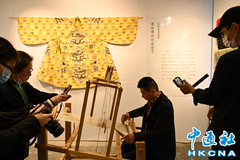 •   4月8日,廣東廣州,“錦綉中華——傳統織染綉藝術與生活展”在廣州市文化館新館廣綉園開幕,來自全國各地近50項具有代表性的傳統織染綉藝術類非遺項目齊聚一堂。圖為蘇州緙絲織造技藝吸引參觀者。 香港中通社圖片
