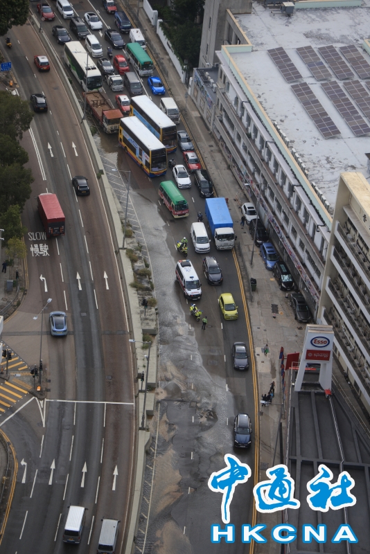 •   8月24日,香港黃竹坑道水管爆裂,近香港仔工業學校的部份行車線暫時封閉,路面發生擁堵。(香港中通社記者 許其皓攝) 香港中通社圖片