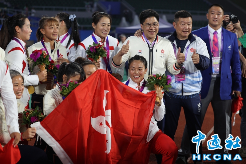 •   9月26日,杭州亞運會女子七人制橄欖球決賽中,中國隊以22比21擊敗日本隊獲得冠軍、中國香港得銅牌。 圖為霍啟剛與女子橄欖球選手合影。(香港中通社記者 洪少葵 攝) 香港中通社圖片