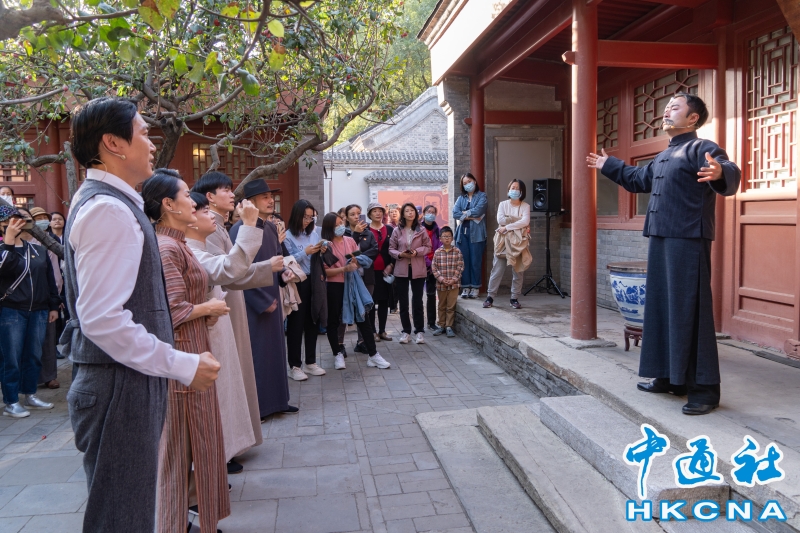 •     10月27日,沉浸式導覽劇《守常先生》在北京李大釗故居上演,圖為演出現場,游覽者身臨其境感受“覺醒年代”。 香港中通社圖片