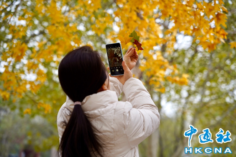 •     北京西山公園,市民撿拾秋葉拍照。 香港中通社圖片