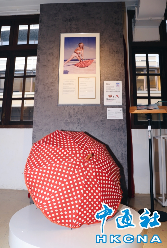 “譜寫傳奇:《花花公子》休·海夫納 x 瑪麗蓮·夢露”將於1月 27日至2月1日在香港中環藝穗會開展,免費展出瑪麗蓮·夢露和《花花公子》創立人休·海夫納的逾50件珍貴藏品。圖為一把紅白圓點傘,配有木制鈎柄,瑪麗蓮·夢露於 1949 年與攝影師安德烈·德·迪尼斯(Andre de Dienes)在琼斯海灘拍攝時使用。(香港中通社記者 曹文毓攝) 香港中通社圖片