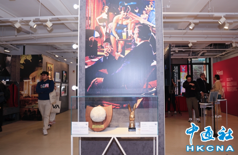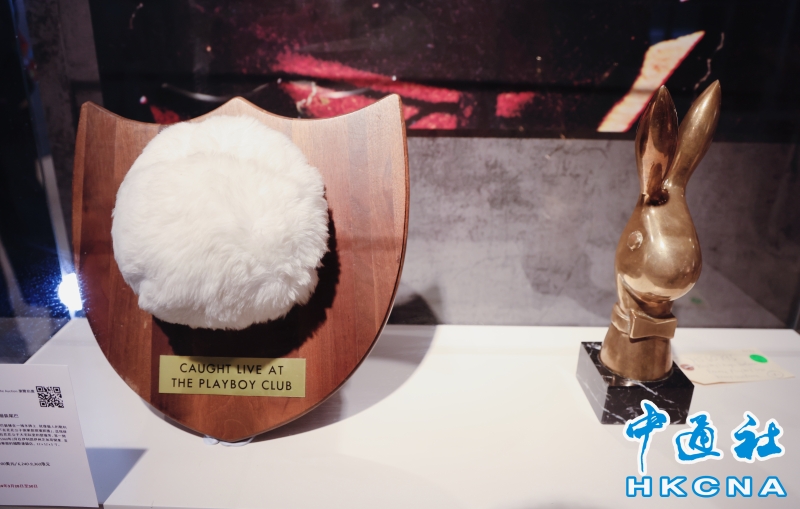 “譜寫傳奇:《花花公子》休·海夫納 x 瑪麗蓮·夢露”將於1月 27日至2月1日在香港中環藝穗會開展,免費展出瑪麗蓮·夢露和《花花公子》創立人休·海夫納的逾50件珍貴藏品。圖為青銅花花公子標誌兔子雕塑(右)、裝裱花花公子兔子服裝尾巴(左)。(香港中通社記者 曹文毓攝) 香港中通社圖片
