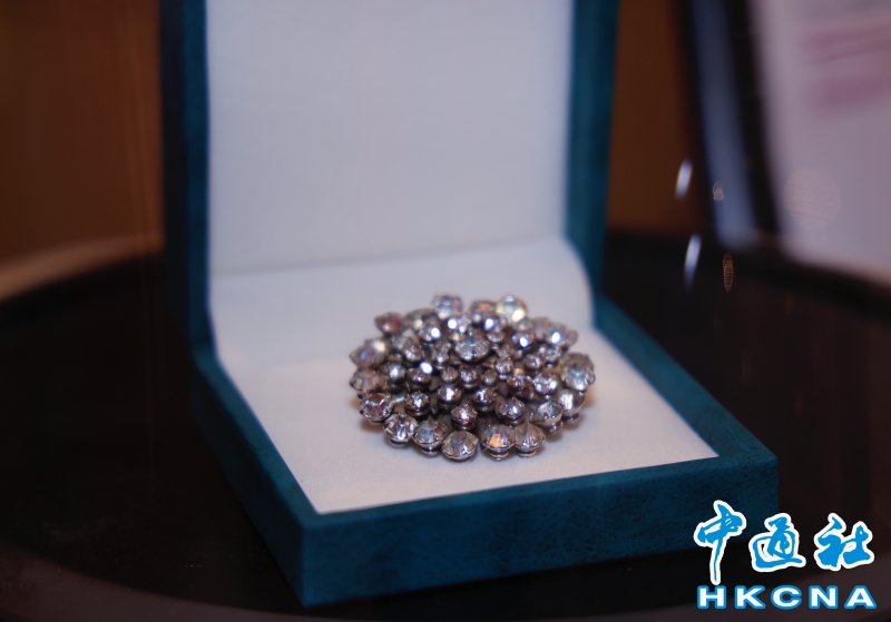 “譜寫傳奇:《花花公子》休·海夫納 x 瑪麗蓮·夢露”將於1月 27日至2月1日在香港中環藝穗會開展,免費展出瑪麗蓮·夢露和《花花公子》創立人休·海夫納的逾50件珍貴藏品。圖為瑪麗蓮·夢露的花飾仿真鑽石胸針。(香港中通社記者 曹文毓攝) 香港中通社圖片