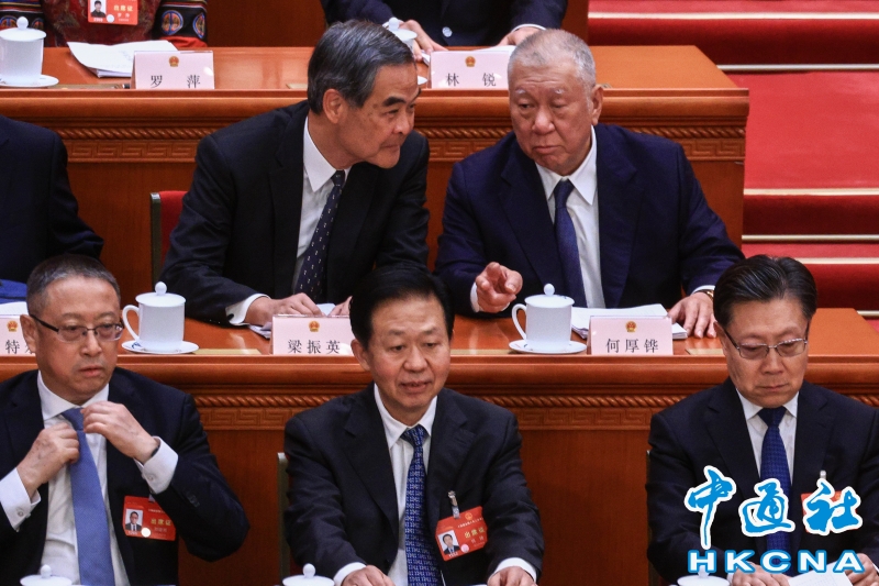 •   3月8日,十四屆全國人大二次會議在北京人民大會堂舉行第二次全體會議。全國政協副主席梁振英(上排左)、全國政協副主席何厚鏵(上排右)列席會議。(香港中通社記者 許其皓攝) 香港中通社圖片
