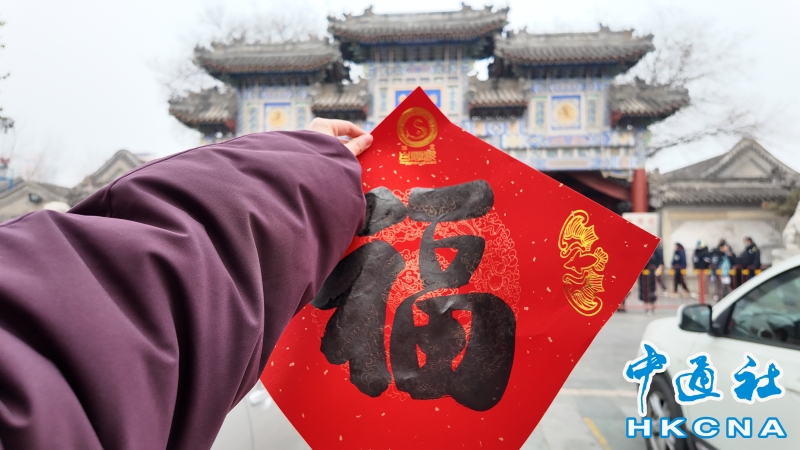 •     白雲觀大門前,領到福字的民眾現場拍照留念。 香港中通社圖片