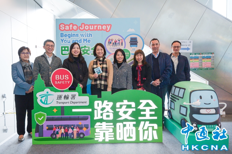 •   運輸署由2月3日起至五月中,將先後在九座政府大樓舉行題為“一路安全靠晒你”的巴士安全巡迴展覽,介紹政府與專營巴士營辦商提升巴士安全的措施,以及提高市民作為乘客的安全意識。展覽首站於西九龍政府合署南座地下大堂舉行,歡迎市民參觀。圖示運輸署署長李頌恩(左四)、運輸署副署長/公共運輸事務及管理郭惠英(左三)、運輸署安全總監李艷芳(右四)與專營巴士安全小組人員合照。 香港中通社圖片
