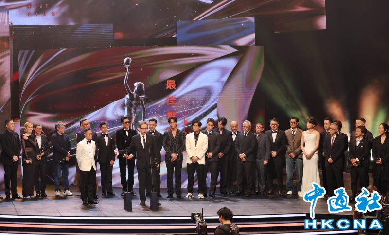 •   4月27日晚,“第43屆香港電影金像獎”頒獎典禮在文化中心大劇院舉行。《九龍城寨之圍城》橫掃金像獎9個獎項 包括最佳電影。圖為最佳電影《九龍城寨之圍城》的全體主創登台領獎。(香港中通社記者曹文毓攝) 香港中通社圖片