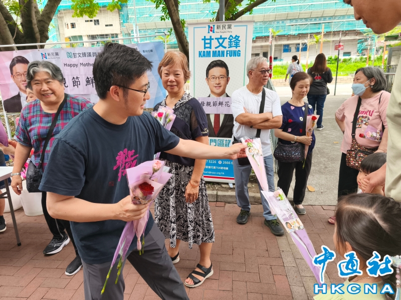 •   5月10日,香港屯門龍門路富健花園街頭,有區議員設攤位向街坊派發花束,慶祝母親節。 香港中通社圖片
