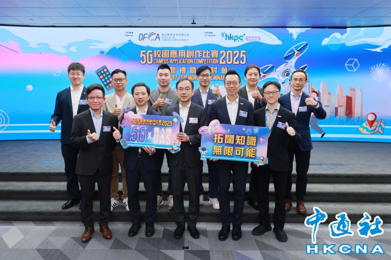 •   5月10日,香港通訊事務管理局辦公室舉辦第三屆“5G校園應用創作比賽”啟動禮暨研討會。圖為通訊事務總監梁仲賢(前排中)與嘉賓、講者及支持機構代表合照。 香港中通社圖片