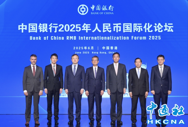 •   6月6日,香港特區財政司司長陳茂波出席中國銀行2025年人民幣國際化論壇。圖為(左三起)中國銀行行長張輝、財政司司長陳茂波、中聯辦副主任祁斌、柬埔寨國家銀行副行長拉索萬諾拉和其他嘉賓在論壇上合照。 香港中通社圖片