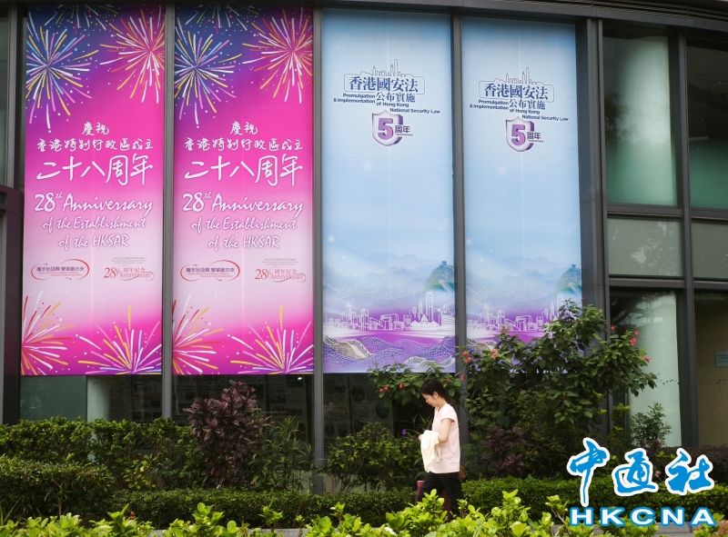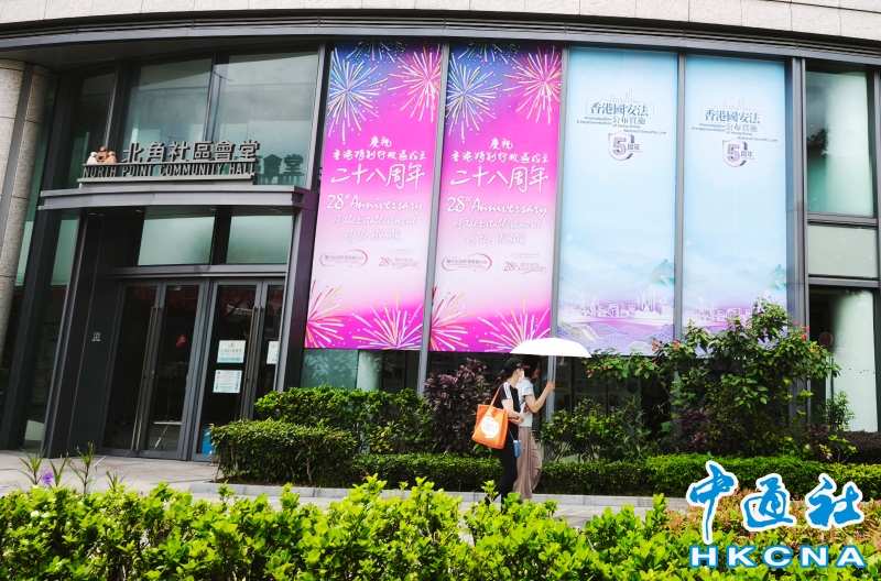 •   香港回歸祖國28週年來臨之際,各區張燈結彩,大型慶祝條幅高掛社區會堂。 香港中通社圖片