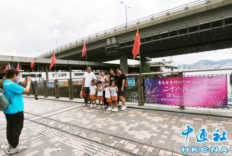 •   香港回歸祖國28週年來臨之際,各區張燈結彩。圖為家長帶小朋友在彩旗和慶祝橫幅前留影。 香港中通社圖片
