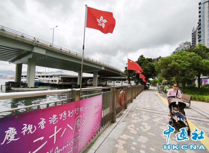 •   香港回歸祖國28週年來臨之際,各區張燈結彩。圖為北角匯海濱彩旗和慶祝橫幅。 香港中通社圖片