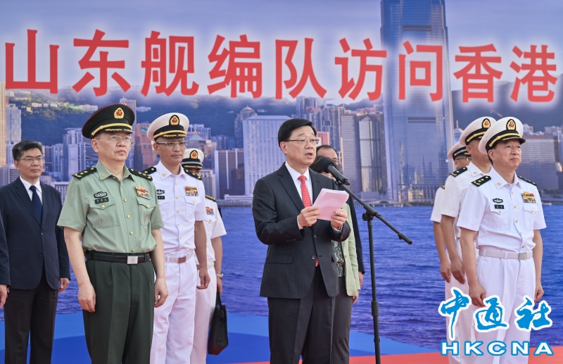 •   7月3日,香港特區行政長官李家超上午在昂船洲軍營出席中國人民解放軍海軍山東艦編隊訪問香港歡迎儀式致辭。 香港中通社圖片
