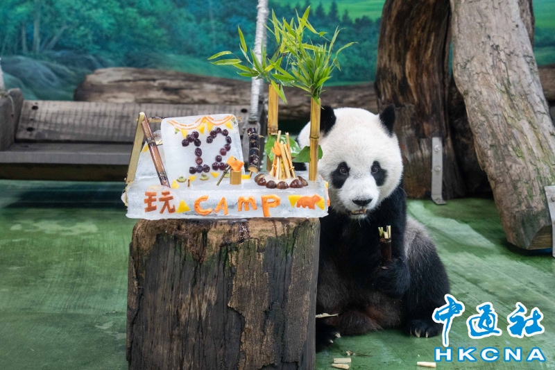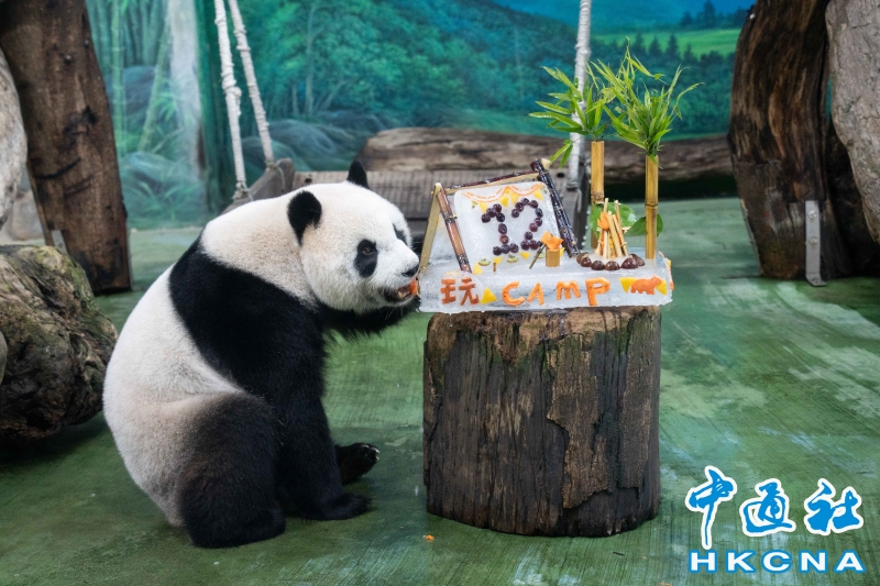 •   7月6日,台北市動物園為今年12歲的大熊貓“圓仔”製作以“露營”為主題的行為豐富化冰蛋糕。以戶外活動為題,運用竹枝、竹桿、紅蘿蔔、葡萄、鳳梨、甘蔗、奇異果等食材,雕刻拚製成帳篷、營火、伐木斧和吊床的模樣。 香港中通社圖片