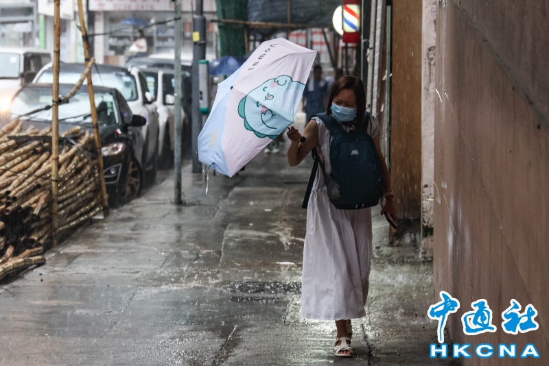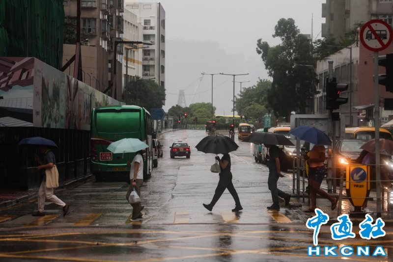 •   7月10日,香港天文台表示,受丹娜絲的殘餘與活躍西南季候風影響,華南沿岸和南海北部有大驟雨及狂風雷暴。天文台在中午12時40分,改發紅色暴雨警告信號。圖為香港市民在暴雨中出行。(香港中通社記者 許其皓攝) 香港中通社圖片
